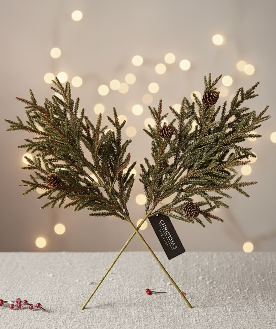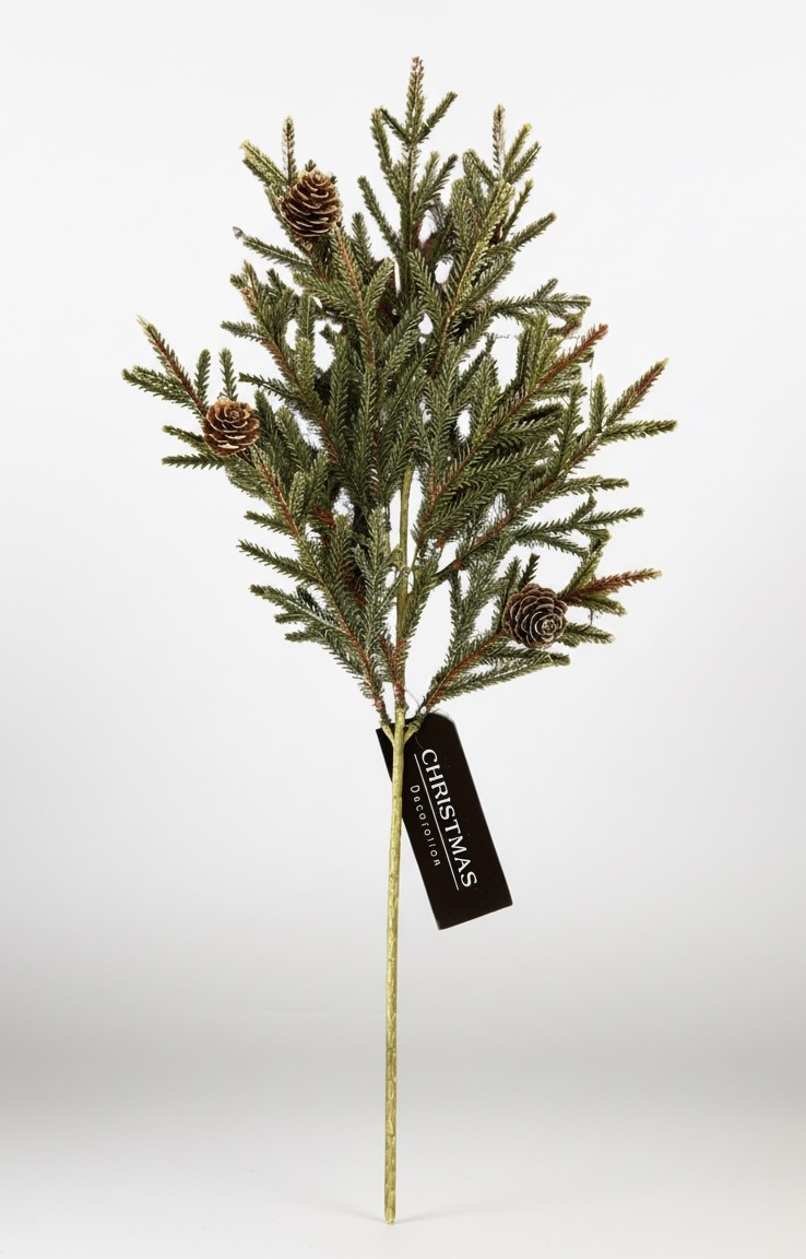 Ramas de pino abeto artificial con piñas, realistas y duraderas, ideales para decorar tu hogar en Navidad. Aportan un toque natural y festivo sin necesidad de mantenimiento. Perfectas para centros de mesa, coronas, guirnaldas o arreglos navideños. Miden 50 cm de largo.